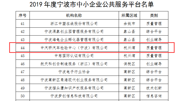 日前,寧波市經濟和信息化局、寧波市企業(yè)服務領導小組辦公室發(fā)布《關于公布2019年度市中小企業(yè)公共服務平臺名單的通知》,認定64家單位為“2019年度寧波市中小企業(yè)公共服務平臺”。中汽中心檢測認證事業(yè)部寧波汽車檢測中心下轄的中汽研汽車檢驗中心(寧波)有限公司(以下簡稱杭州灣分中心)名列其中!